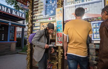 Kyiv, Ukraine - May. 03, 2017: Street scene in Kyiv. Disadvantaged and impoverished people on the street of Kiev. A beggar asks for alms for food
