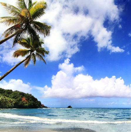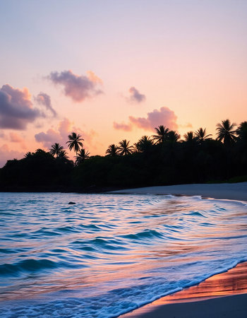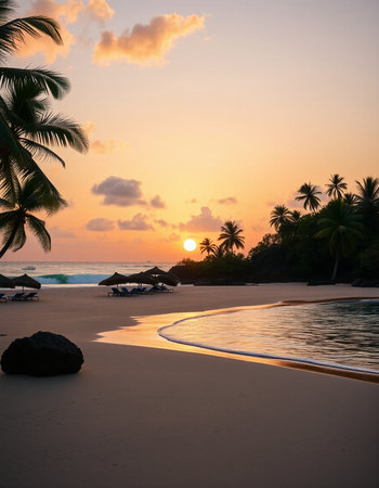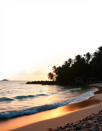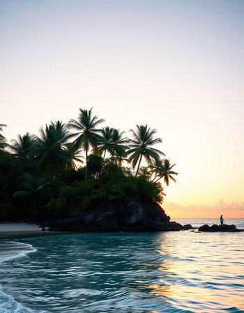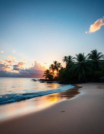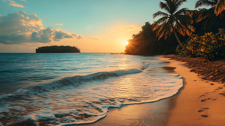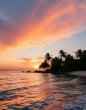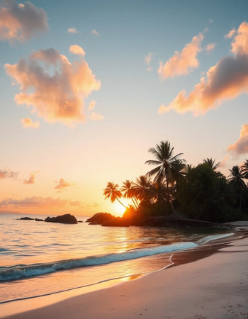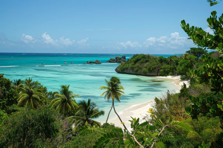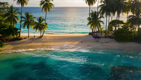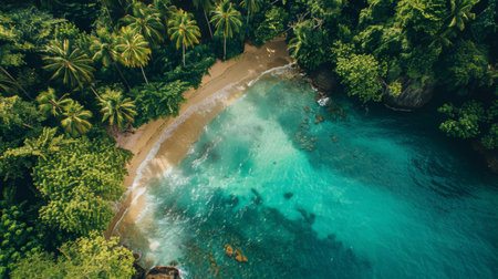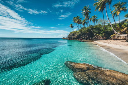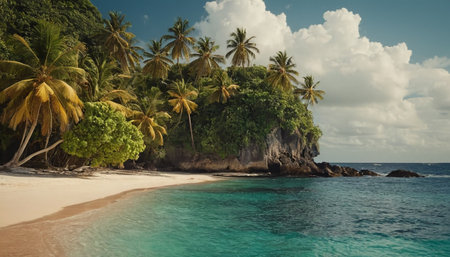 Tranquil and serene tropical beach paradise with secluded sandy beaches, lush greenery, and palm trees for a perfect vacation destination