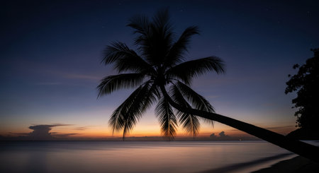 A prominent palm tree silhouette stands against a vibrant sunset sky over the calm ocean, with faint stars beginning to appear. A tranquil tropical beach scene at dusk.