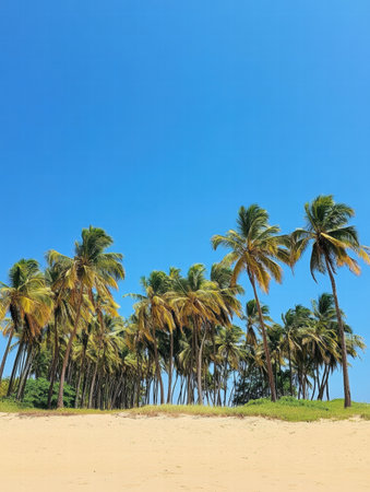 Palm trees are seen swaying gently under a vivid blue sky on a tranquil beach filled with golden sand, creating a peaceful atmosphere.