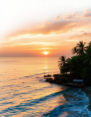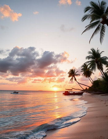 Beautiful sunset on the beach with palm trees and a boat.