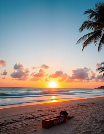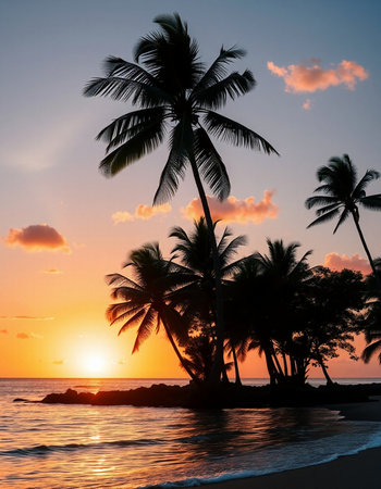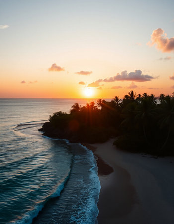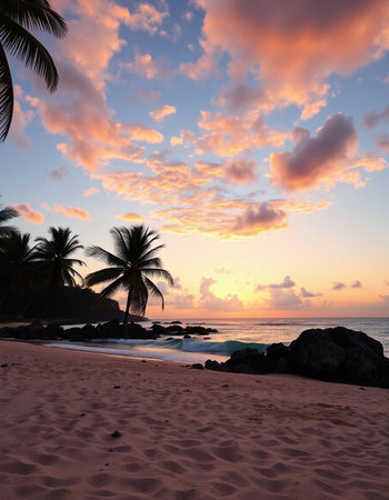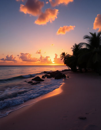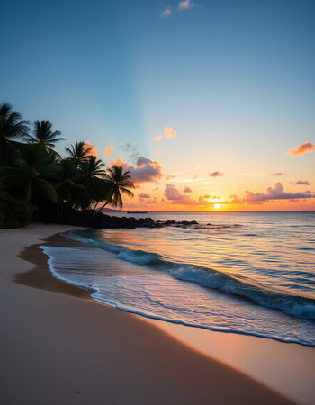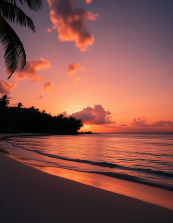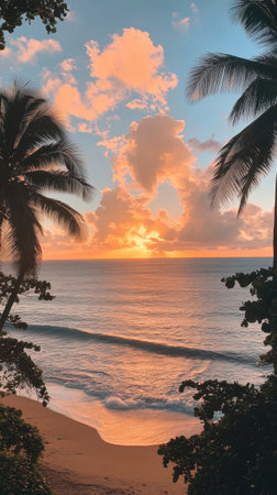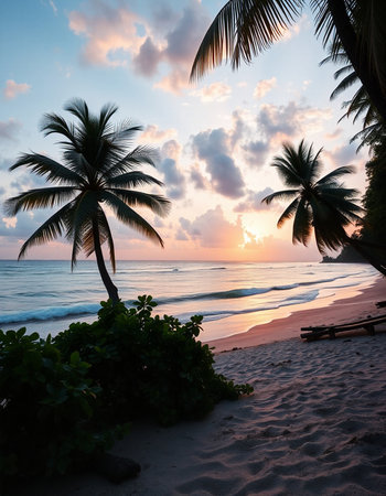 Witness the tranquil beauty of a Caribbean sunrise with vibrant clouds reflecting morning light, framed by lush palm trees and the peaceful sounds of ocean waves.