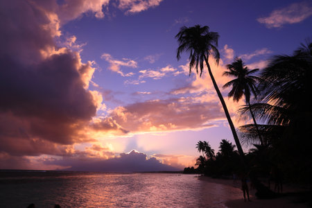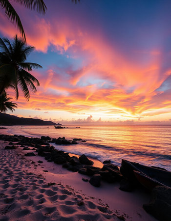 Experience a captivating sunset casting vibrant colors over the Caribbean Sea, with silhouetted palm trees enhancing the tranquil atmosphere of Deshaies, Guadeloupe.