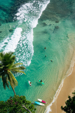 Aerial shot of surfers and crystal-clear waves on a pristine tropical beach with lush foliage