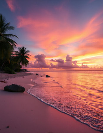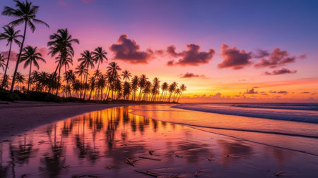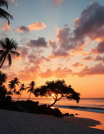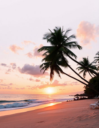 Tropical beach at sunset with palm trees and a beautiful sky
