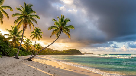 A picturesque travel destination with crystal-clear turquoise waters, golden sandy beaches, and palm trees swaying in the breeze. Captivating imagery for travel brochures, vacation advertisements, and destination websites.