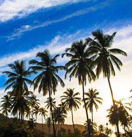 Coconut palm trees at sunset on the island of Sri Lanka