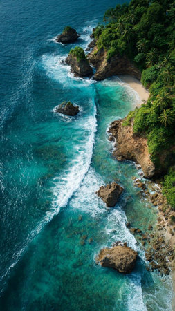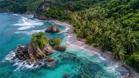 Discover a breathtaking aerial view of a serene tropical beach showcasing lush greenery, vibrant turquoise waters, and majestic rocky formations. Perfect for nature lovers.
