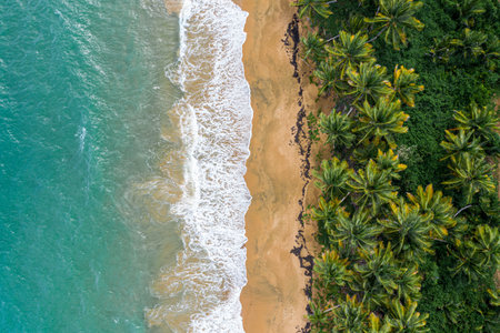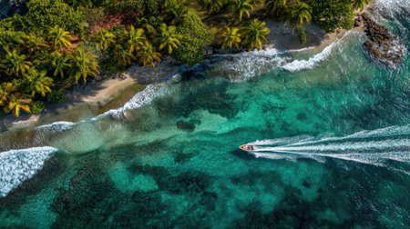 Aerial view of tropical beach with lush palm trees and pristine blue waters