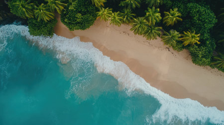 Generative AI : Beautiful white sandy beach with turquoise ocean water waves and green fluffy palm trees Aerial top view copy space