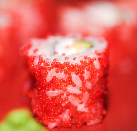 Gunkan sushi stuffed with red tobiko caviar. Macro. Located on ceramic plate. Can be used as a whole background.
