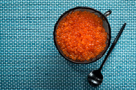 Closeup of spoon with red caviar on a background. appetizer seafood