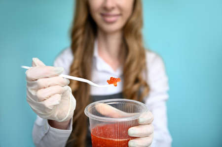 Delicacy seafood retail. A fishmonger in a fish store holding a jar with salmon caviar.