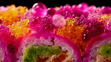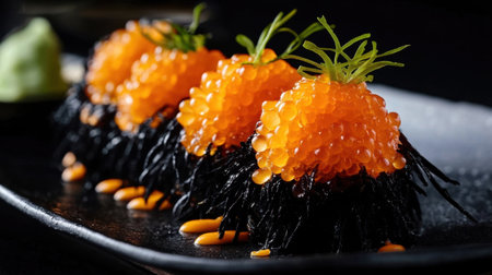 An elegant presentation of sushi adorned with vibrant salmon roe, resting on a dark plate. This image captures the gourmet quality and artistry of Japanese cuisine.