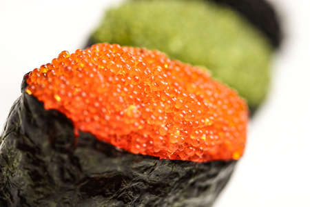 Japanese traditional food. Fresh gunkan maki sushi rolls with multicolored caviar. Isolated on a white background