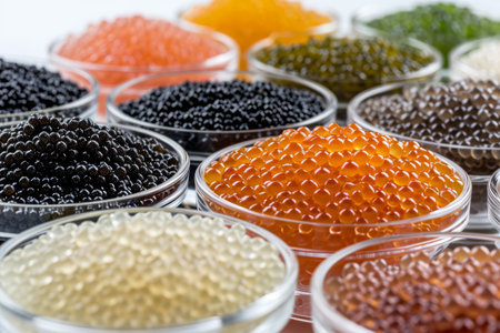Assortment of Different Colored Beads in Bowls, A variety of different caviar types, each with their distinct color and size, displayed side by side for comparison, AI Generated