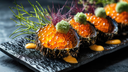 Indulge in a luxurious sea urchin platter, showcasing fresh uni garnished with vibrant accents. Perfect for upscale dining and gourmet experiences.