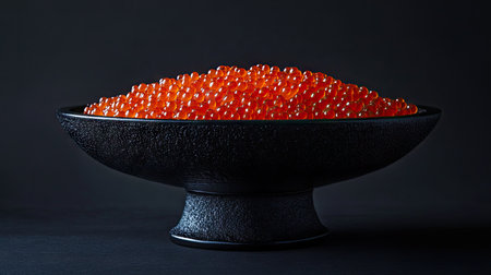 A striking image of fresh salmon roe presented in a sleek black bowl. The vibrant orange pearls create a stunning culinary centerpiece, perfect for gourmet dishes.
