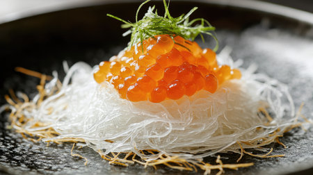 A beautifully presented dish featuring salmon roe resting atop a bed of shredded ingredients, creating an elegant and vibrant culinary masterpiece perfect for gourmet dining.