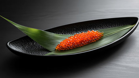 This image showcases a traditional Japanese dish featuring vibrant salmon roe elegantly served on a leaf, highlighting exquisite culinary presentation and cultural artistry.
