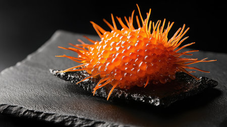 A stunning presentation of fresh uni, artfully arranged on a textured slate platter. This vibrant seafood delicacy highlights gourmet culinary artistry and elegance.