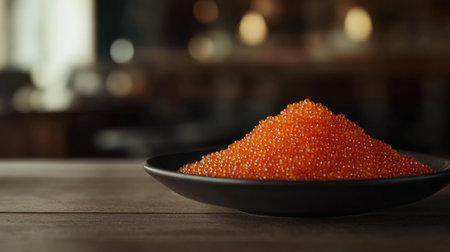 A stunning display of fresh salmon roe piled high in a sleek black dish. The glistening orange beads create an inviting and luxurious culinary experience.