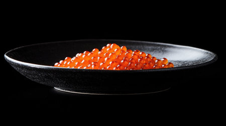 A stunning presentation of luxurious salmon roe on a sleek black plate. The vibrant orange beads create an eye-catching contrast, perfect for gourmet dishes.