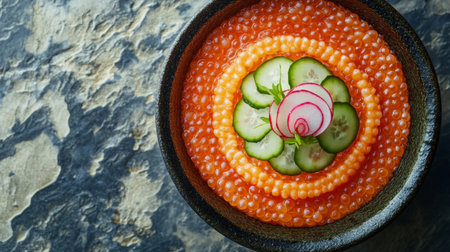 This eye-catching bowl features fresh salmon roe artfully arranged with sliced cucumbers and radishes, set against a rustic background, perfect for food photography or culinary projects.