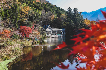 Scenic Waterfront View with Vintage Architecture in Yufuin, Japan