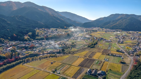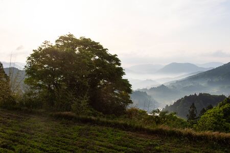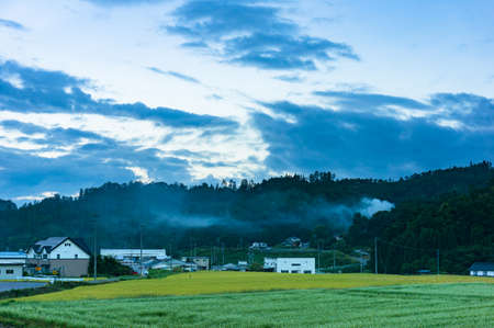 Japanese countryside village landscape with fields and mountains in early morning with low clouds and fog