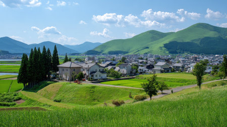 View on japanese countryside with forested hills on background.