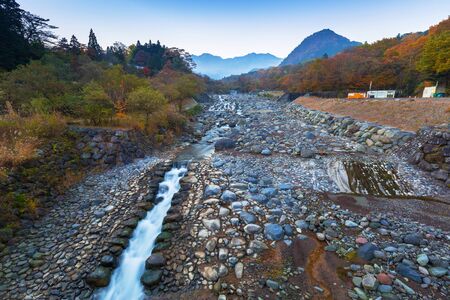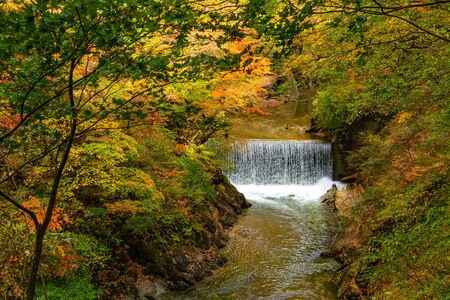 Beautiful landscape at Naruko Gorge with the colorful foliage of autumn season and the flow of clear natural stream in Naruko City, Miyagi Prefecture, Japan.