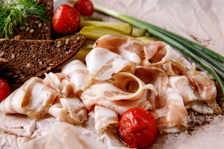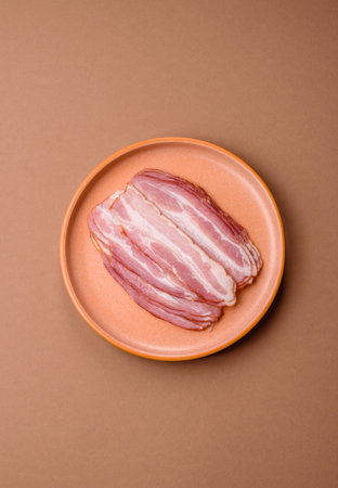 Meat, raw pork bacon sliced, organic food, protein for snacks. Raw bacon as a food background for your design