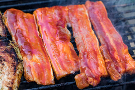 Raw smoked melting grilled barbecue bacon slices, being cooked on bbq smoke grill, close up