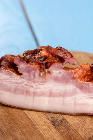 close up of rustic traditional dry cured smoked artisan gourmet bacon