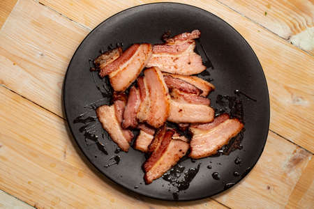 Cooked crispy bacon, slices of roast pork for an English breakfast. Fried bacon for the morning table