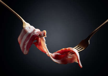 Bacon slices on a fork. Smoked bacon on a black background with copy space.