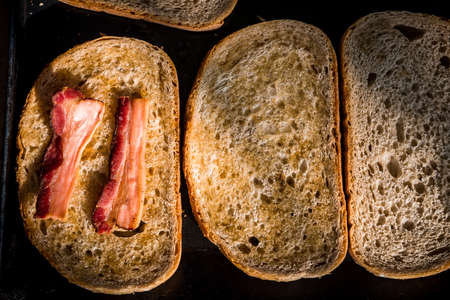 sandwich with slices of fat bacon on a light background keto diet with pepper