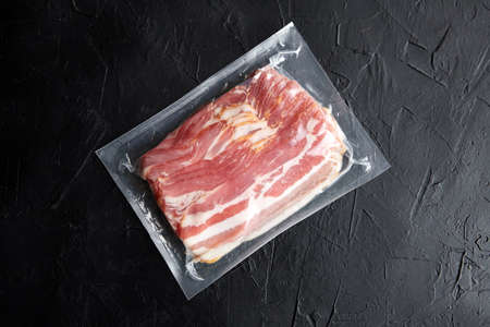 Bacon strips, raw smoked pork meat slices in vacuum package on black stone table top view