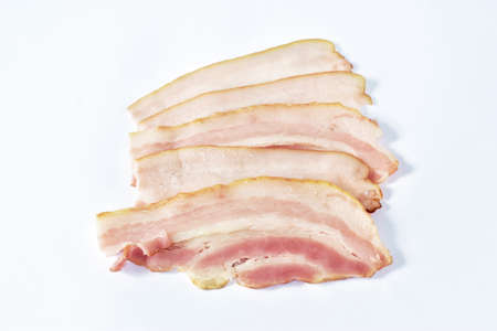 Close-up of appetizing slices of smoked bacon. Isolated on white background. With baking paper.