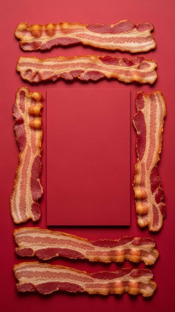 A close-up photo of crispy bacon strips arranged in a pattern on a black background. The bacon is cooked to perfection and has a rich, savory flavor.