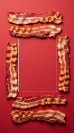 Close up shot of crispy bacon strips on a black surface. Perfect for breakfast, lunch, or snack.