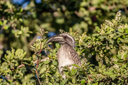 African grey hornbill in tree in Madikwe Game Reserve in South Africa.