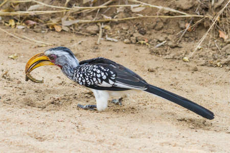 Southern yellow-billed hornbill (Tockus leucomelas) eating a caterpillar larva in Kruger National Park, South Africa with bokeh background