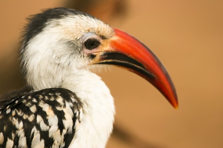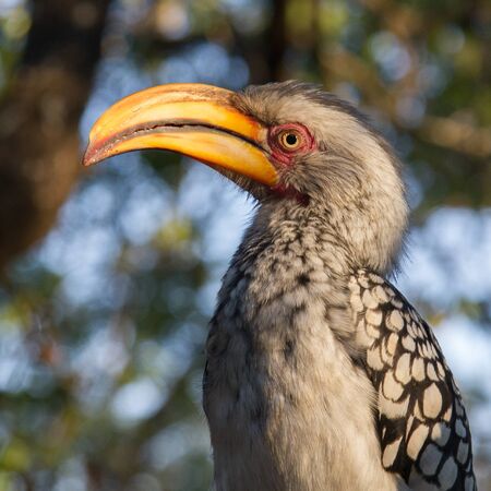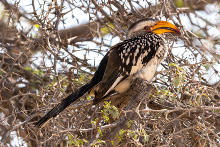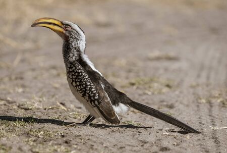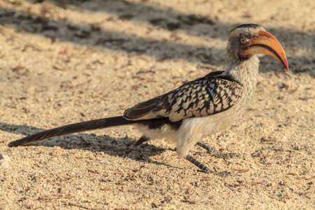 Close up of southern yellow billed hornbill, or Tockus leucomelas, in Kgalagadi Transfrontier Park, South Africa