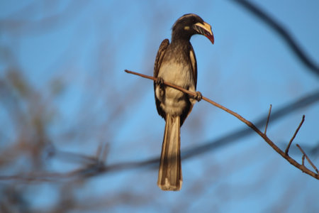 yellow-beaked hornbill on barren tree against clear blue sky, Kruger Park, South Africa