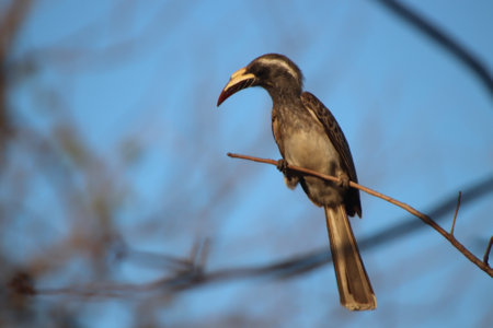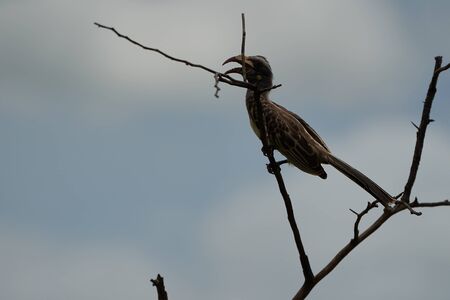 African grey hornbill (Lophoceros nasutus sitting on a branch of a tree, curiously looking at something down below in a private reserve in South Africa.