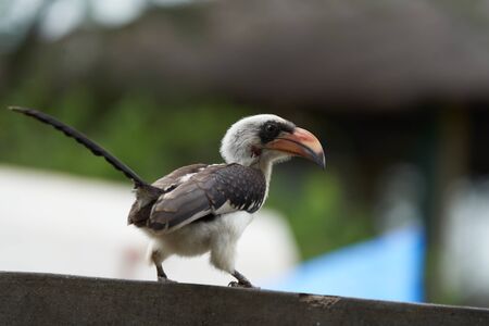 A Red-billed hornbill stands on the platform. A grass is in front of its beak. Large numbers of animals migrate to the Masai Mara National Wildlife Refuge in Kenya, Africa. 2016.