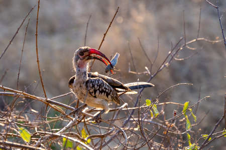 Red-billed hornbill eating a grasshopper in Namibia Africa
