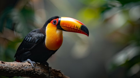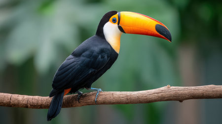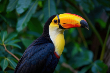 Colorful black toucan perched on forest branch with vibrant green leaves in natural habitat